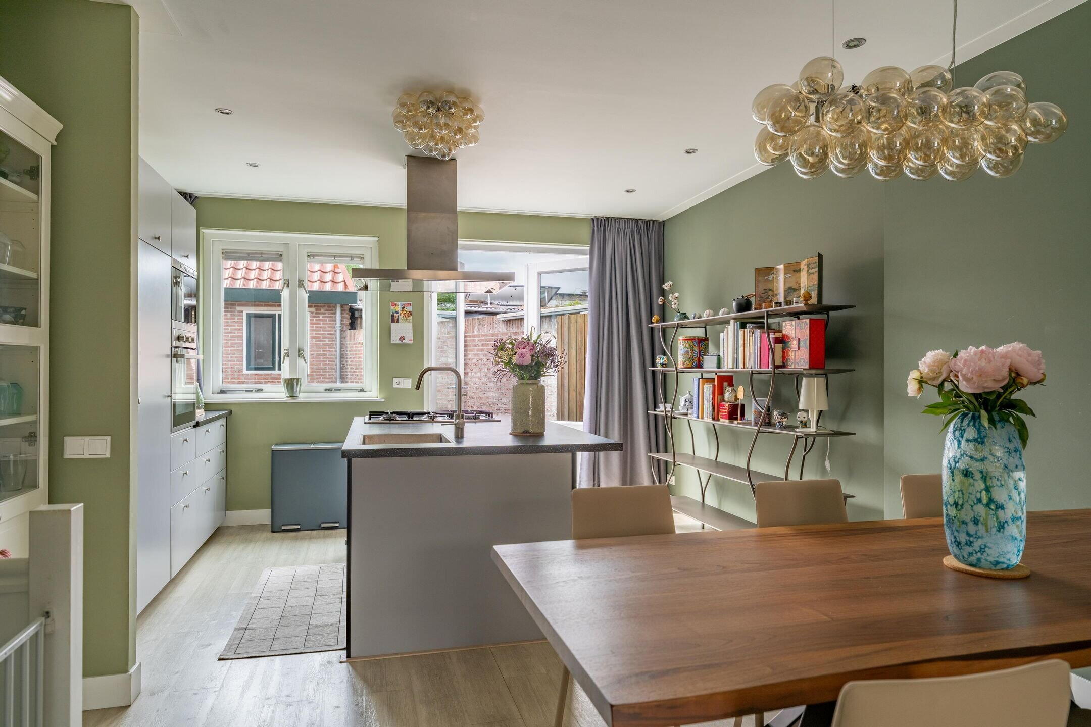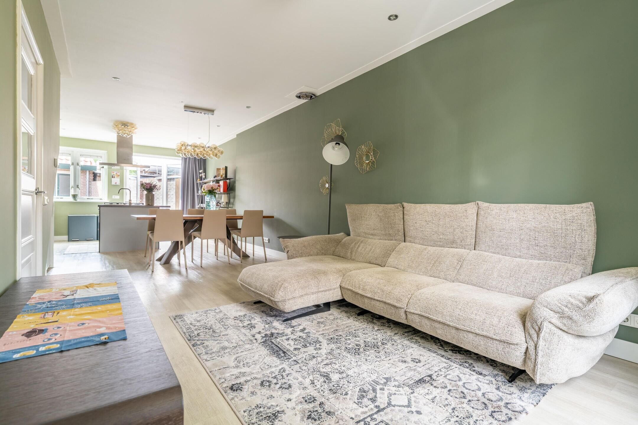 Via de hal betreed je de lichte woonkamer met mooie laminaatvloer en bovenlichten in zeer stijlvolle glas-in-loodramen die direct al sfeer geven. De moderne open keuken met kookeiland is van alle gemakken voorzien. Dankzij de openslaande deuren aan de achterzijde stap je zo de zonnige tuin in, waardoor binnen en buiten naadloos in elkaar overlopen. In een tussenhal bevindt zich in Italiaanse sfeer betegelde moderne toilet.