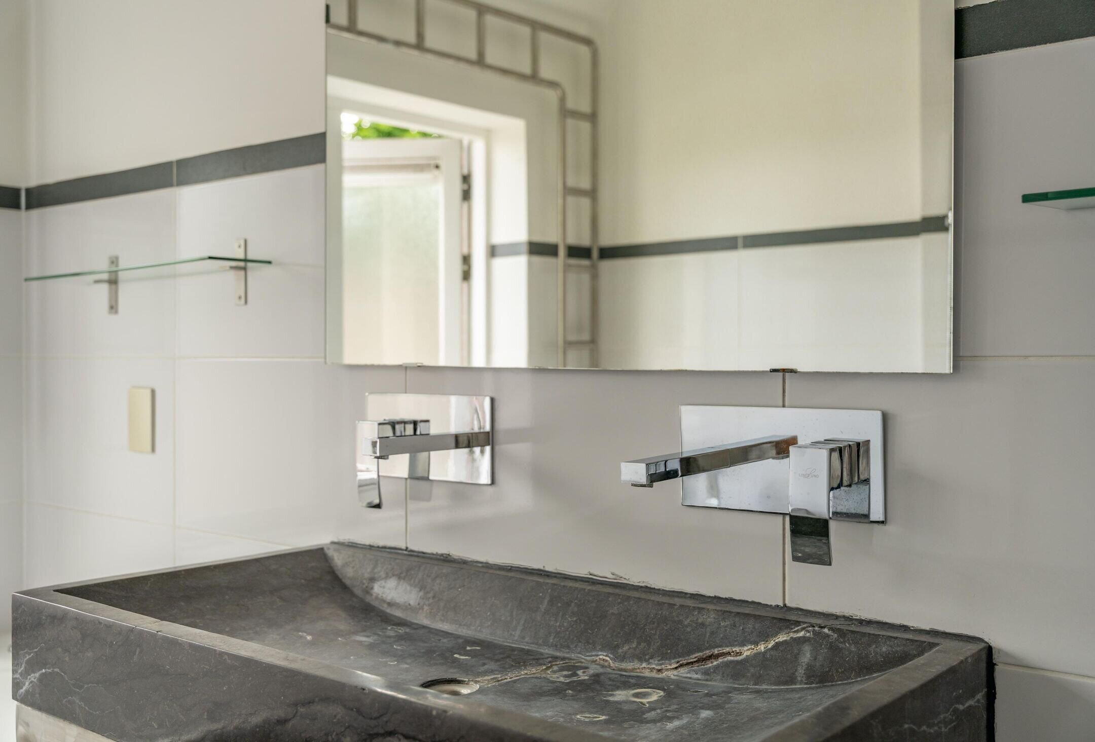 - Douche, dubbele wastafel, en ligbad