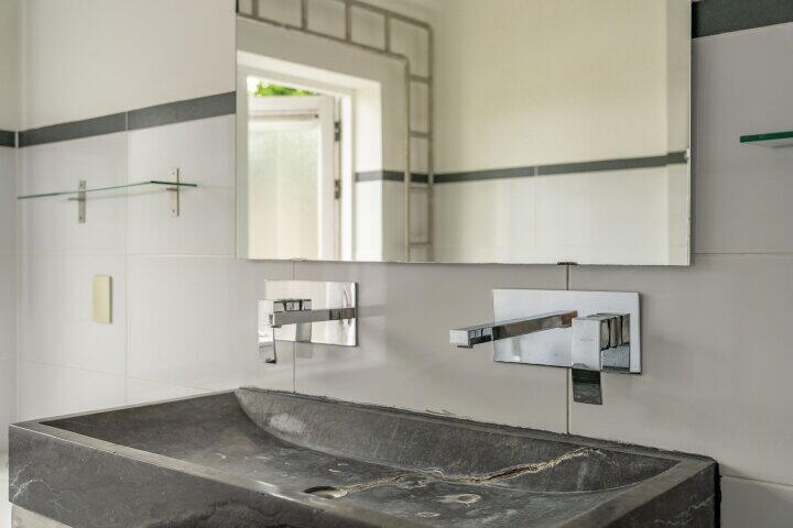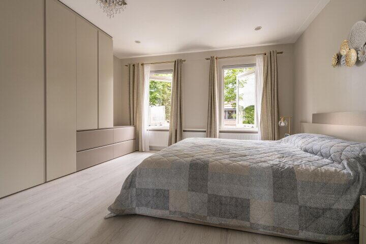 Op de eerste verdieping vind je twee slaapkamers, waaronder een royale master bedroom met ingebouwde kastenwand. De luxe badkamer is voorzien van een dubbele douche, een ligbad en een dubbel stenen wastafelmeubel. Een tweede toilet bevindt zich separaat op de overloop in een ruim bemeten ruimte die ook nog dienst doet als een praktische wasruimte.